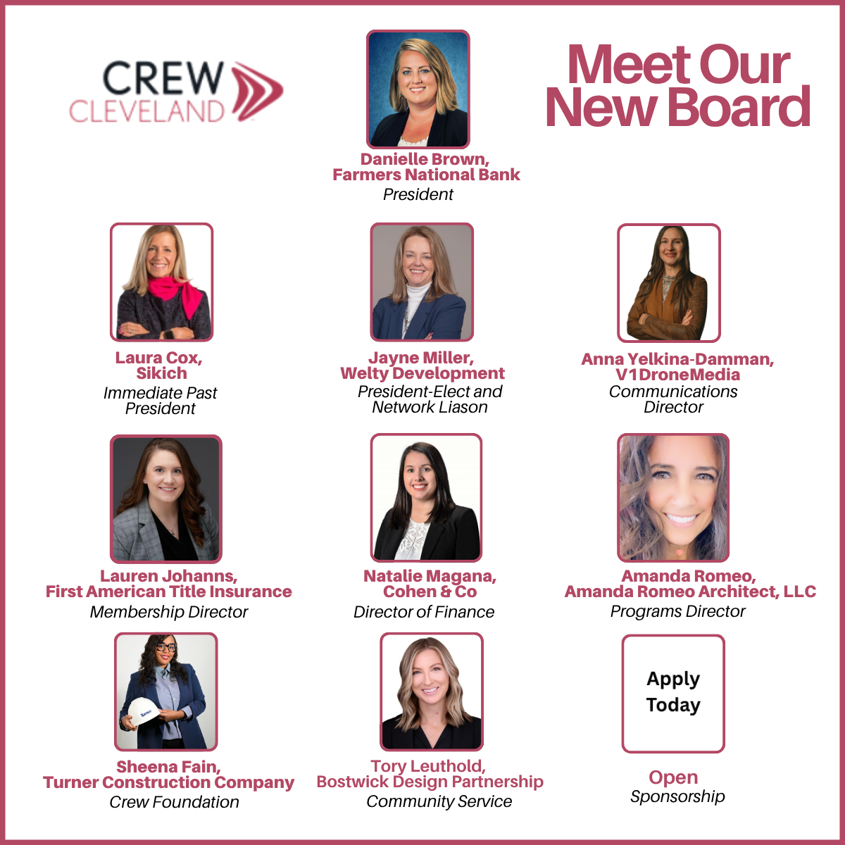 Serving on the CREW Cleveland’s Board of Directors is a unique opportunity for leadership and networking among other Professionals working in the commercial real estate field. All CREW Cleveland Board members, directors, and committee chairs serve individual terms of two to three years.